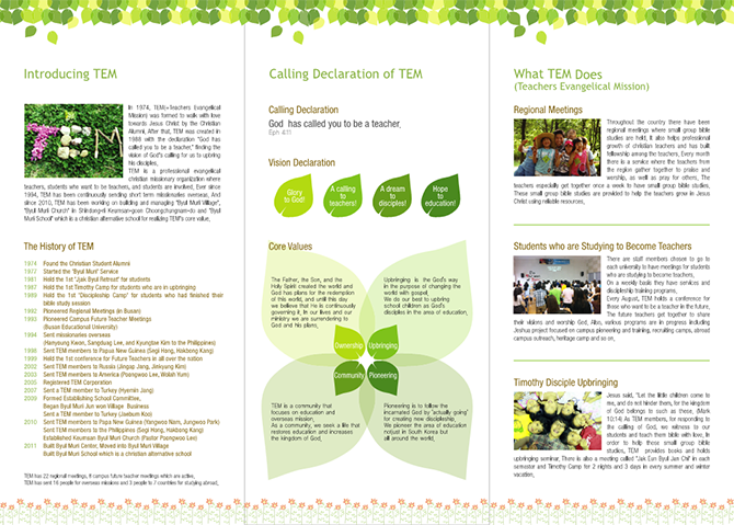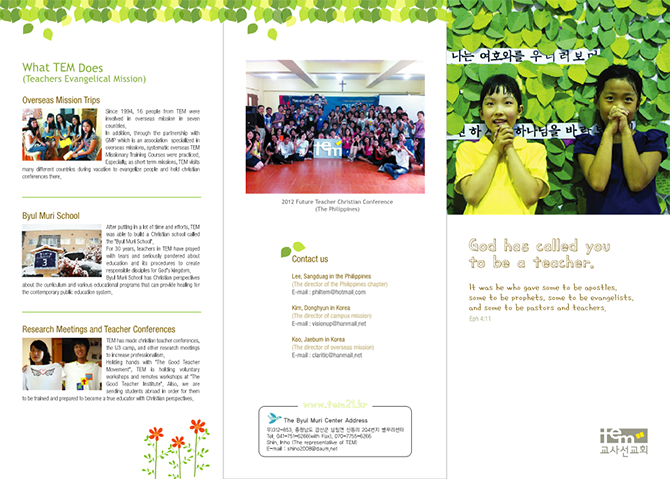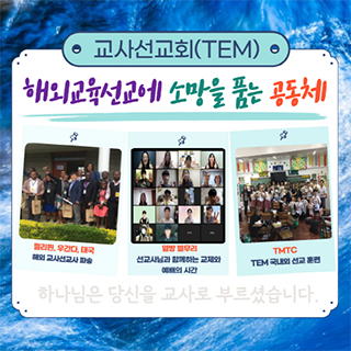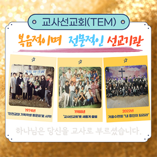 Teachers Evangelical MissionThe Teachers' Mission (TEM) is an evangelical and professional Christian missionary organization that began in 1974 as the "Incheon National University of Education Christian Student Alumni Association." It officially launched as the "Teachers' Mission" in 1988, under the mission statement, "God has called you to be a teacher." Currently, there are teacher groups in 36 regions nationwide and prospective teacher groups on 12 campuses (including PNU in the Philippines).